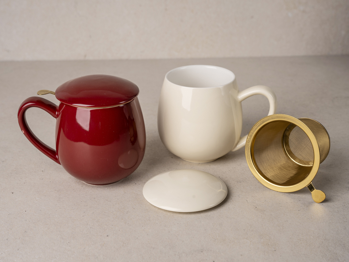A modern stílusú teás bögre rozsdamentes acél szűrővel, valamint porcelán fedéllel, amely melegen tartja a főzetet. Nagyszerű választás a minőségi tea kedvelőinek.