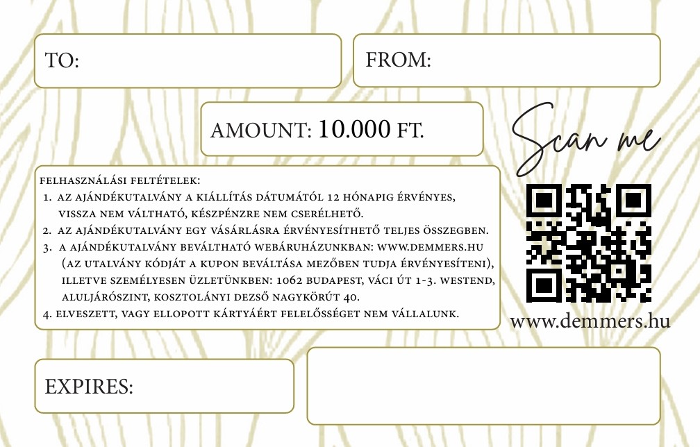 3. A ajándékutalvány beváltható webáruházunkban: www.demmers.hu (az utalvány kódját a kupon beváltása mezőben tudja érvényesíteni), illetve személyesen üzletünkben: 1062 Budapest, Váci út 1-3. Westend, aluljárószint, Kosztolányi Dezső nagykörút 40.
