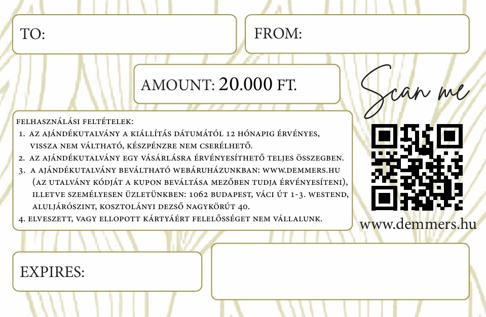3. A ajándékutalvány beváltható webáruházunkban: www.demmers.hu (az utalvány kódját a kupon beváltása mezőben tudja érvényesíteni), illetve személyesen üzletünkben: 1062 Budapest, Váci út 1-3. Westend, aluljárószint, Kosztolányi Dezső nagykörút 40.