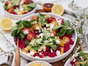 Céklás superfood saláta fetával és citrusos teás öntettel